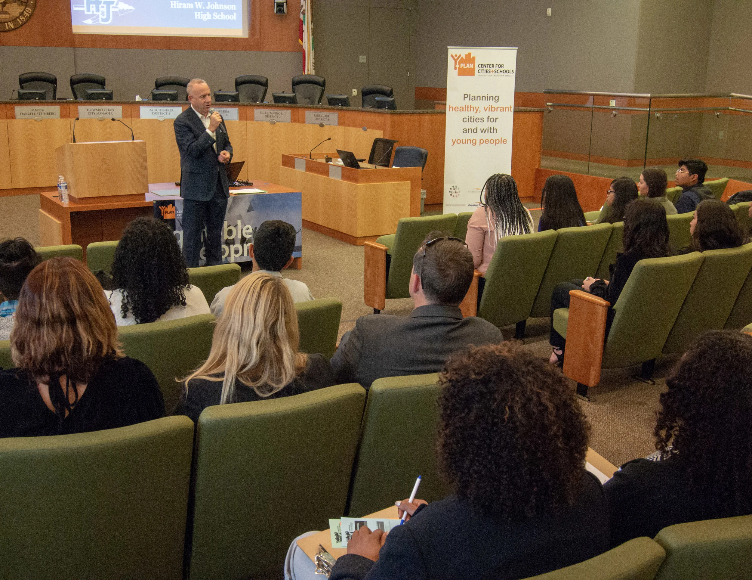 May 16, 2018 - Students from Hiram Johnson High School and Arthur A. Benjamin Health Professions High School presented thoughtful and insightful solutions to civic issues at the culminating event of their Y-PLAN experience. Students from Hiram Johnson presented well researched projects on how to improve school community relationships and Health Professions students presented solutions on housing and homelessness. Mayor Darrell Steinberg made remarks to the students for the second year in a row.
