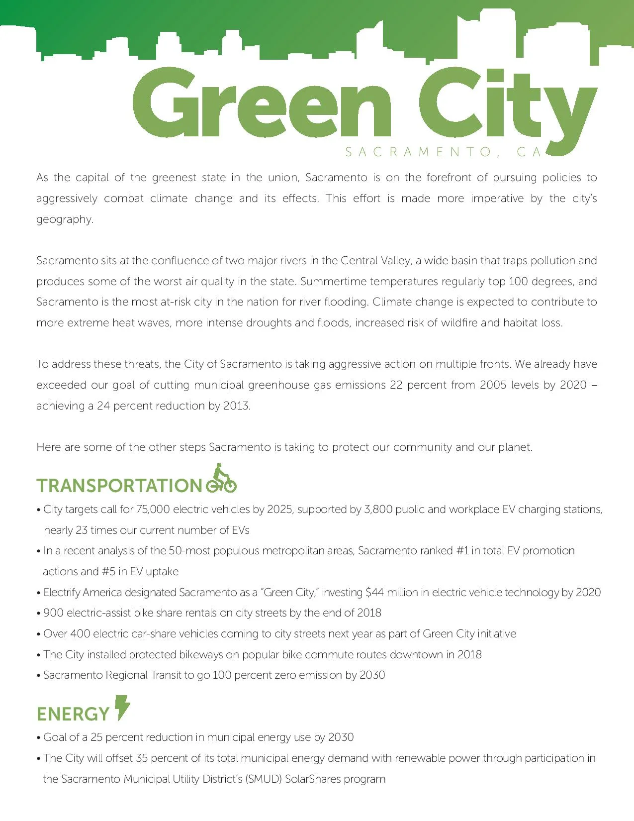 Sacramento has already adopted numerous policies to cut emissions and grow a new economy based on clean technology. It has been a national leader in promoting shared forms of mobility powered by electricity. These efforts include the city’s selection by Electrify America as a “Green City,” a designation that will bring $44 million in new investments to promote electric vehicle use, including more than 400 EV car-share vehicles for rent on city streets. Electric assist bike-shares, introduced earlier this year, have been a huge hit with residents.