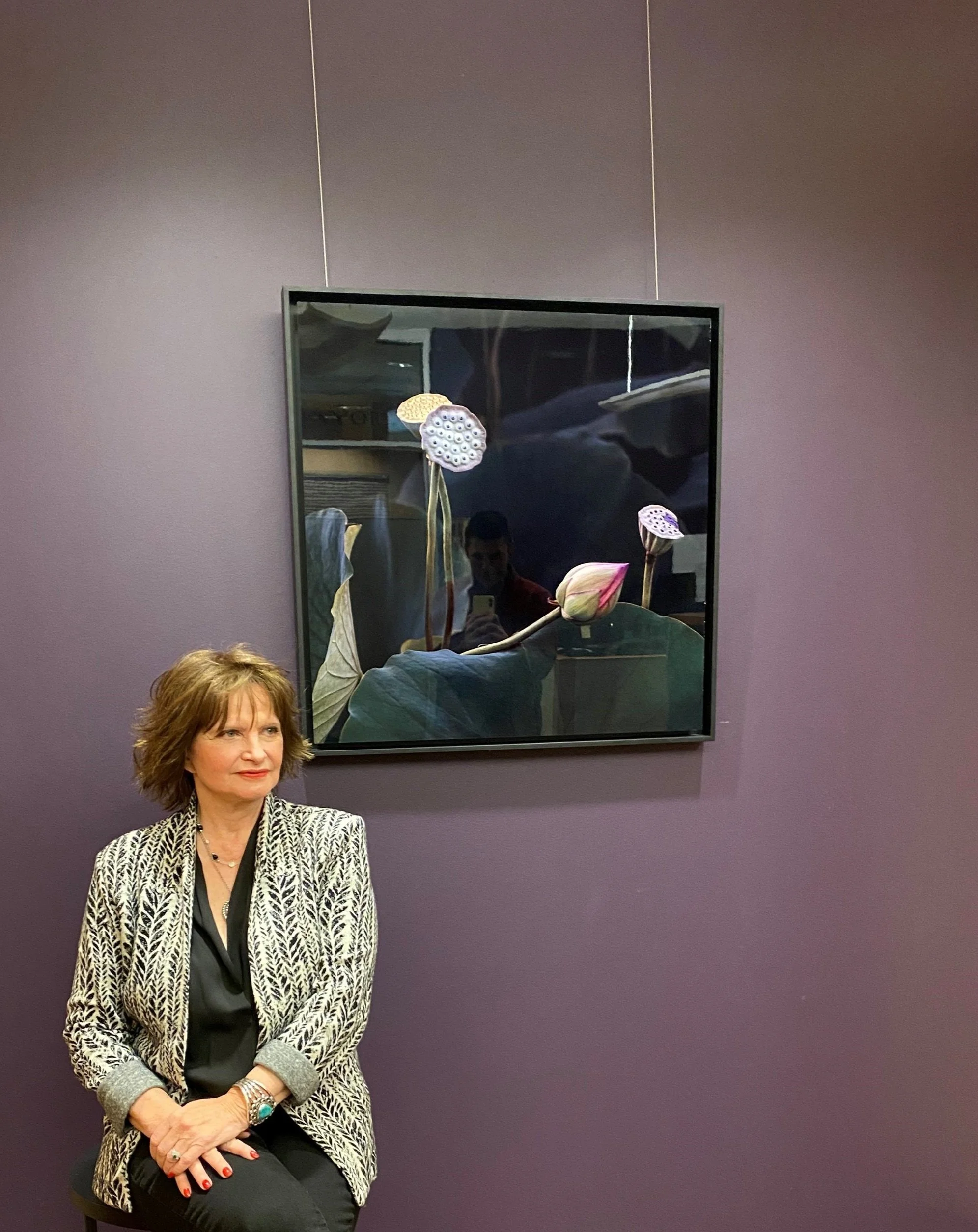 The photo depicts by the beautiful lotus flowers at William Land Park, and in unique coincidence, the same lotus flowers featured in last month’s work by featured artist Jill Estroff.