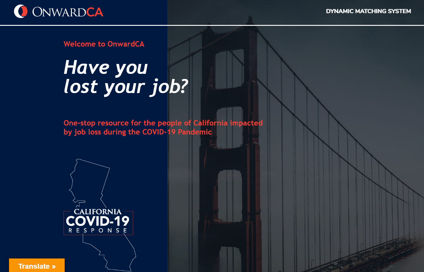 OnwardCa.org is a one-stop resource providing support to people impacted by job loss in the wake of the COVID-19 pandemic. Displaced workers looking for help can: