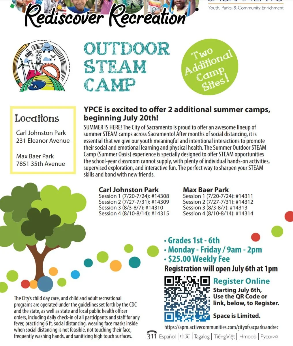 STEAM Camp in the original four parks began on July 6 and some spots are still open for later sessions. Camps are ongoing at East Portal Park, 1120 Rodeo Way; Garcia Bend Park, 7654 Pocket Road: North Natomas Regional Park, 2501 New Market Drive; and William Land Park, 12th Avenue and E. Park Road.