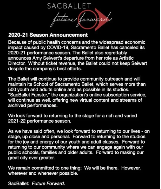 Sacramento Ballet announces cancellation of season and departure of its new artistic director due to the economic impact of Covid-19.