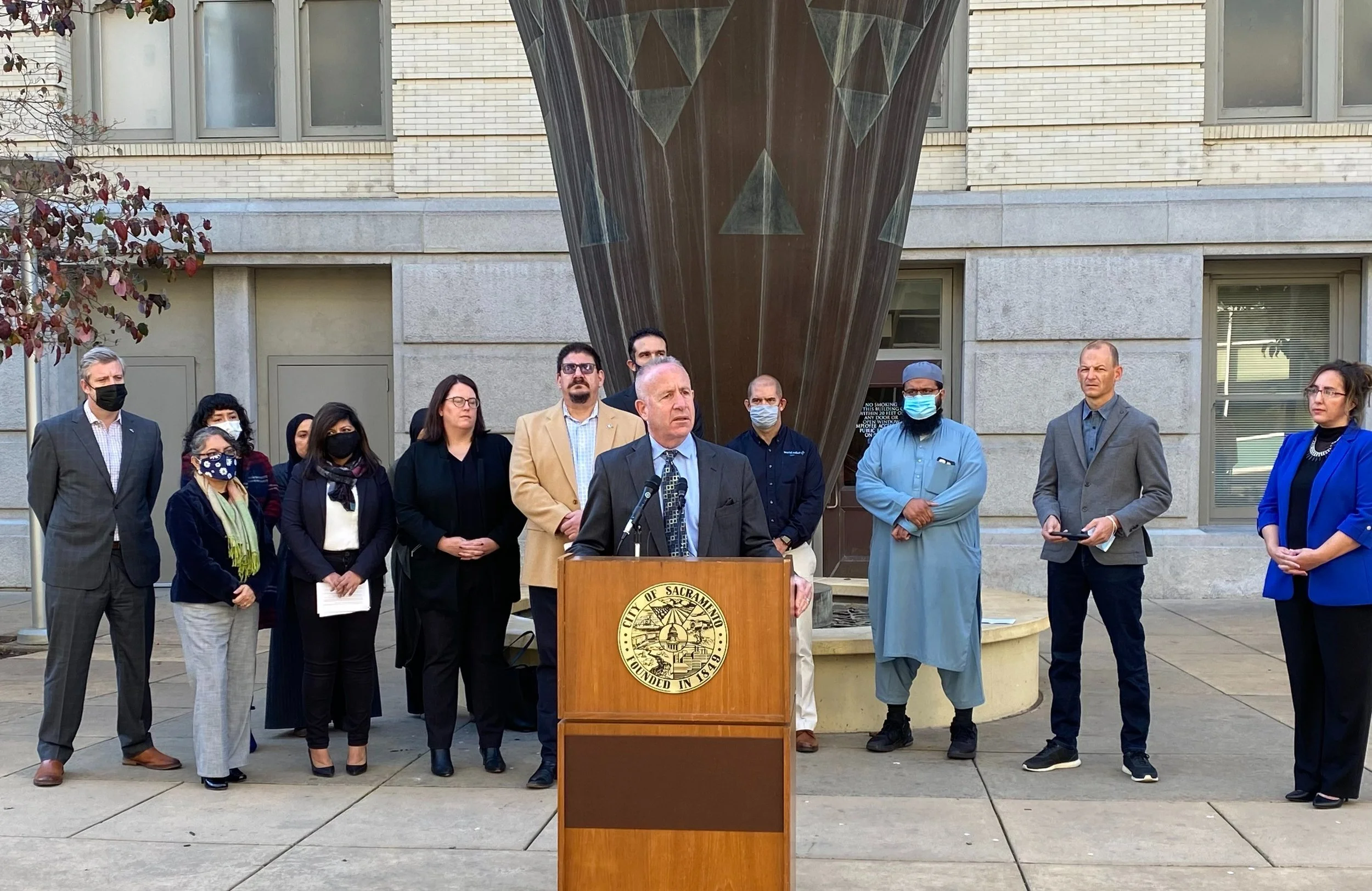 (Sacramento - Nov. 22, 2021) Sacramento’s welcoming spirit was on display Monday morning as Mayor Darrell Steinberg, flanked by members of the local Afghan and Muslim-American community, helped launch a new community coalition focused on helping Afghan communities settle in Sacramento. Local elected leaders, resettlement agencies, non-profit partners and business partners joined Mayor Steinberg to highlight ongoing resettlement efforts.