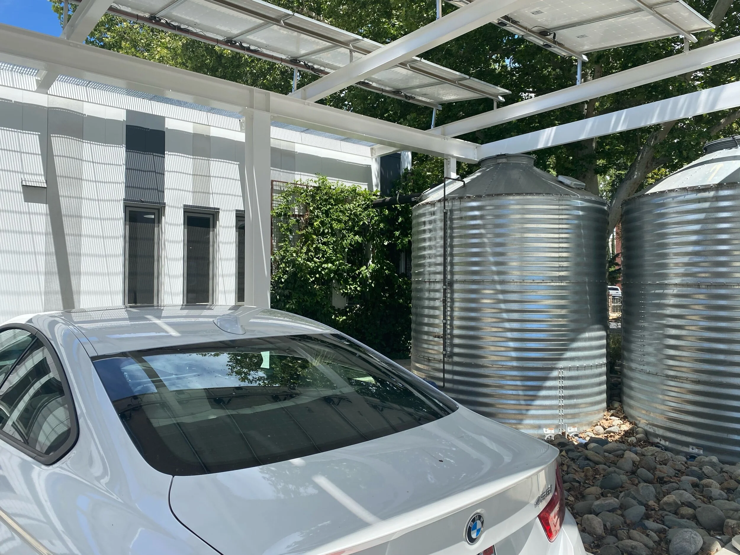Solar panels, electric car chargers and rainwater cisterns at Archnexus