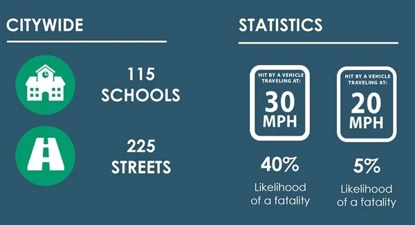 The nine schools that will see improvements from this funding are among the 20 schools highlighted in the Vision Zero School Safety Plan, a targeted effort to improve traffic safety and biking and walking access at schools under the broader Vision Zero Program.