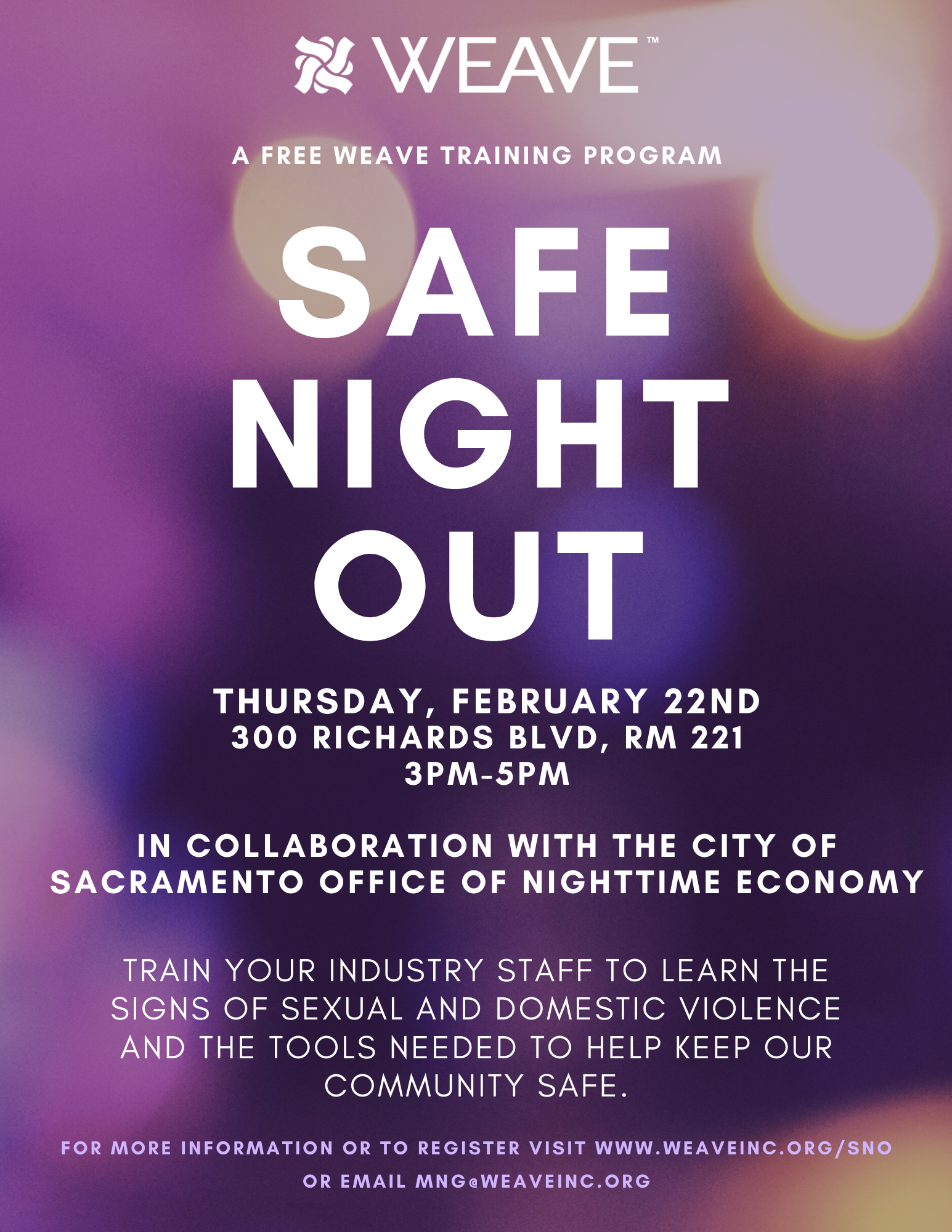 The City of Sacramento Office of Nighttime Economy is partnering with local nonprofit crisis intervention center WEAVE to offer “Safe Night Out” training for hospitality businesses from 3 to 5 p.m. on Feb. 22.